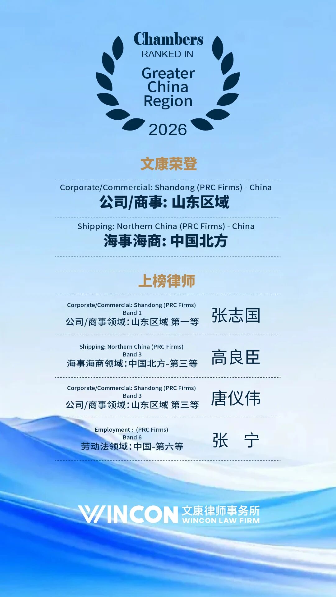 2026年1月15日,国际权威法律评级机构钱伯斯(Chambers & Partners)发布了《2026钱伯斯大中华区法律指南》(Greater China Region Guide 2026),文康律师事务所凭借卓越的专业能力和良好的业界口碑,公司/商事、海事海商领域及高级合伙人张志国、高良臣、唐仪伟、张宁律师上榜。